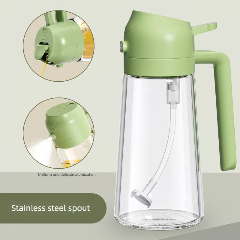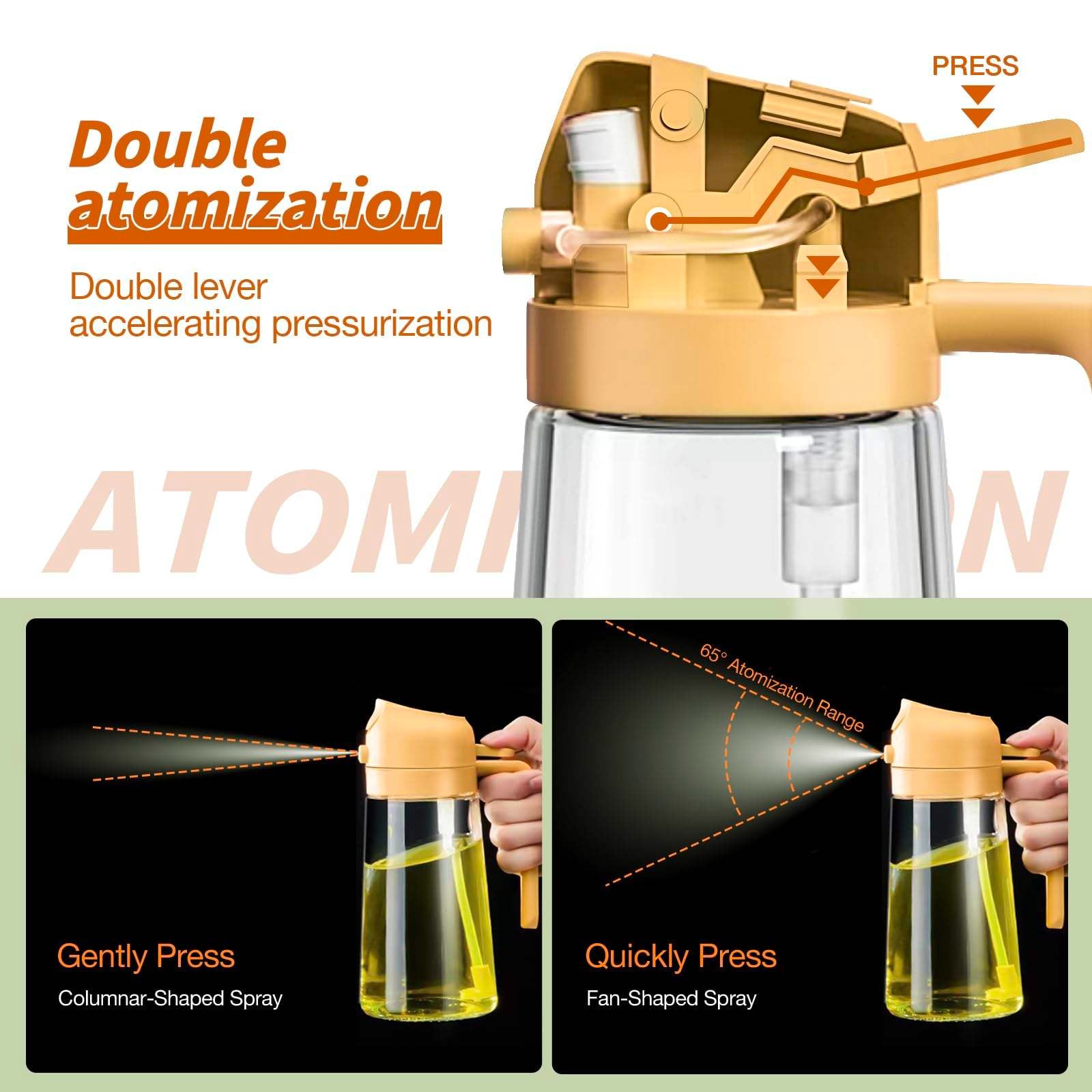 The 2-in-1 Oil Sprayer & Dispenser Bottle is an innovative kitchen essential designed for effortless cooking, grilling, and meal preparation. Crafted from food-grade, BPA-free materials and thick, lead-free glass, this premium 470ml oil dispenser ensures durability and purity while allowing easy monitoring of oil levels. The dual-function design lets you seamlessly switch between a fine mist spray and a steady pour, offering precision oil control for healthier, low-fat cooking. Its upgraded nozzle dispenses approximately 0.15g of oil per spray, helping you regulate your daily intake with minimal waste. Featuring a leak-proof, anti-drip spout, this oil mister prevents messes, keeping hands and kitchen counters clean. The wide mouth opening simplifies refilling, and the ergonomic handle ensures a comfortable grip. Whether you're air frying, roasting, BBQing, dressing salads, or sautéing, this multi-purpose oil sprayer delivers the perfect amount of oil every time. Upgrade your culinary experience with this versatile, refillable, and reusable cooking oil sprayer and dispenser—your go-to tool for precision cooking and mess-free kitchen management!