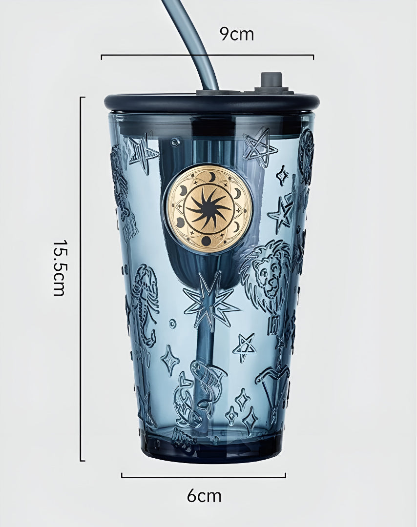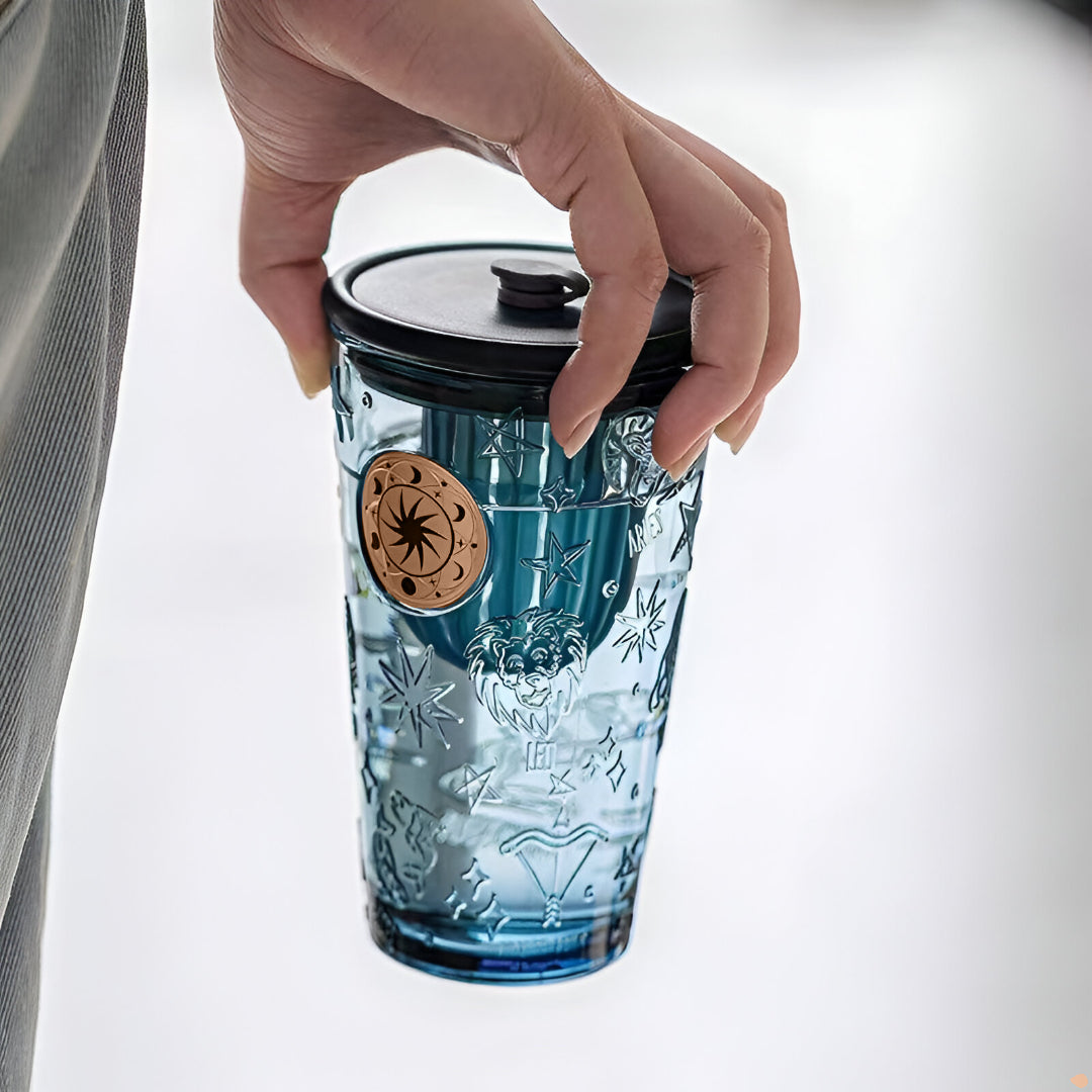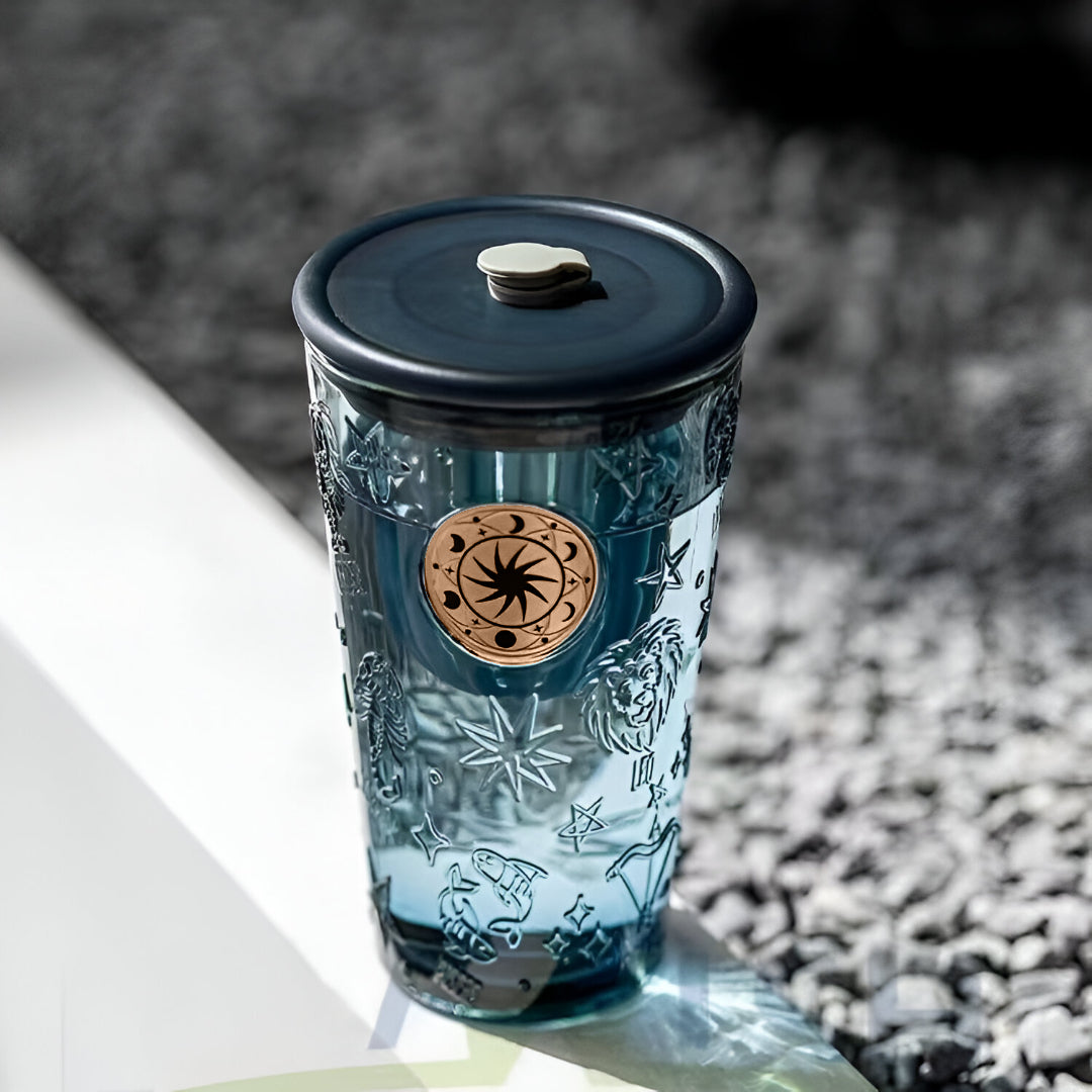 Sip in style with the Blue Constellation Cup – a 450ml celestial-themed tumbler designed to make your everyday drinks feel cosmic. Crafted from thick, premium-quality glass in a rich midnight blue shade, this cup is adorned with intricate constellation, zodiac, and star motifs that give it a truly mystical vibe. It features a BPA-free plastic lid with a matching reusable straw and an inbuilt infuser, making it perfect for fruit-infused waters, teas, or herbal blends. The embossed texture offers a satisfying grip, while the striking golden emblem adds a luxurious touch. Whether you're working, relaxing, or on-the-go, this cup brings the stars right to your hands.