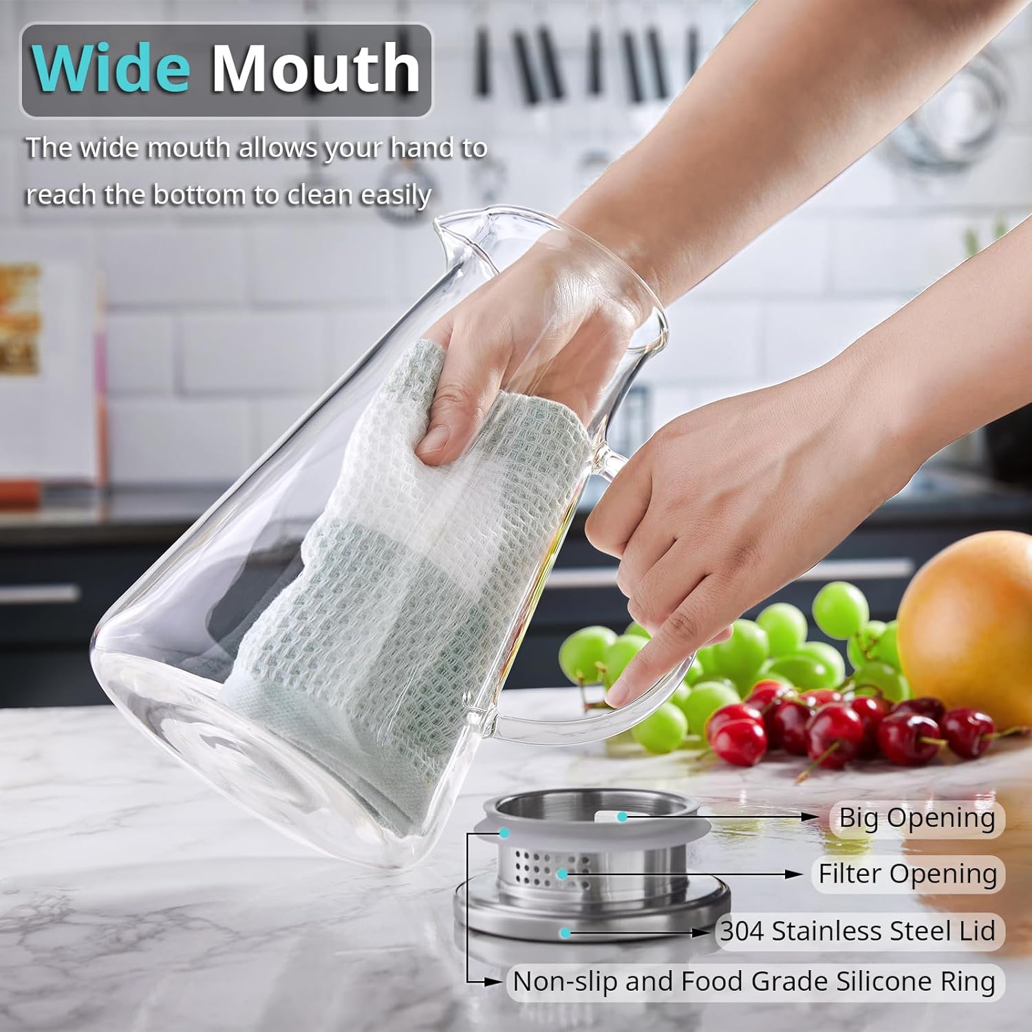 Cleaning our glass pitcher is an easy task, thanks to its wide mouth and included brush. Simply rinse it out with warm water or pop it in the dishwasher for easy cleaning. With its durable borosilicate glass construction and rust-resistant lid, this pitcher is built to last, even with daily use.
