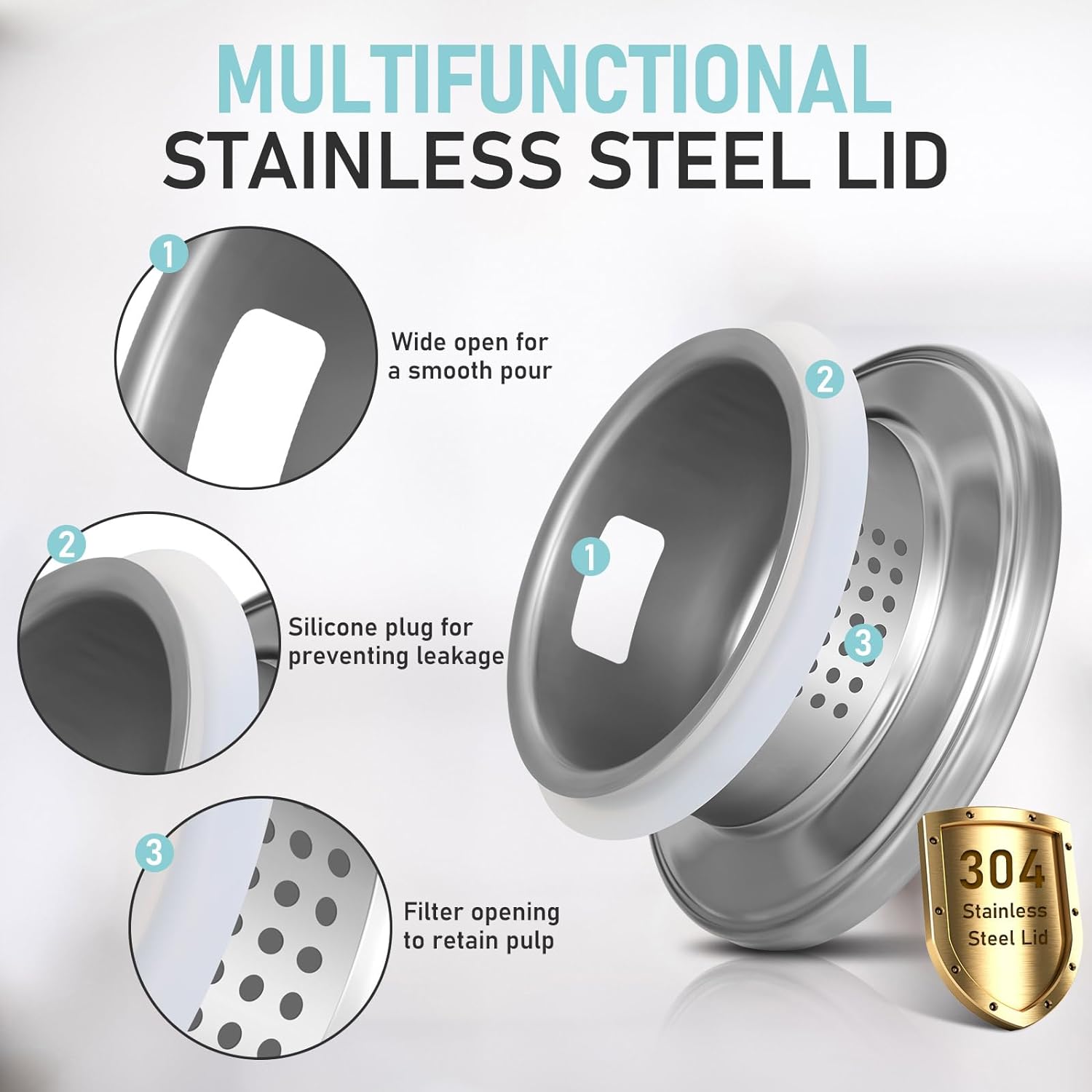 The lid is made of 304 stainless steel. If the lid becomes loose when pouring water, remove the silicone ring from the lid and put it in the opposite direction, and the lid will become tight. The lid is detachable and has a smooth surface, it has two outlets, one for fast water pouring and the other for filtration, great for keeping ice, large chunks of fruit, and tea bag inside the pitcher; also because of the two outlets the pitcher is not airtight.