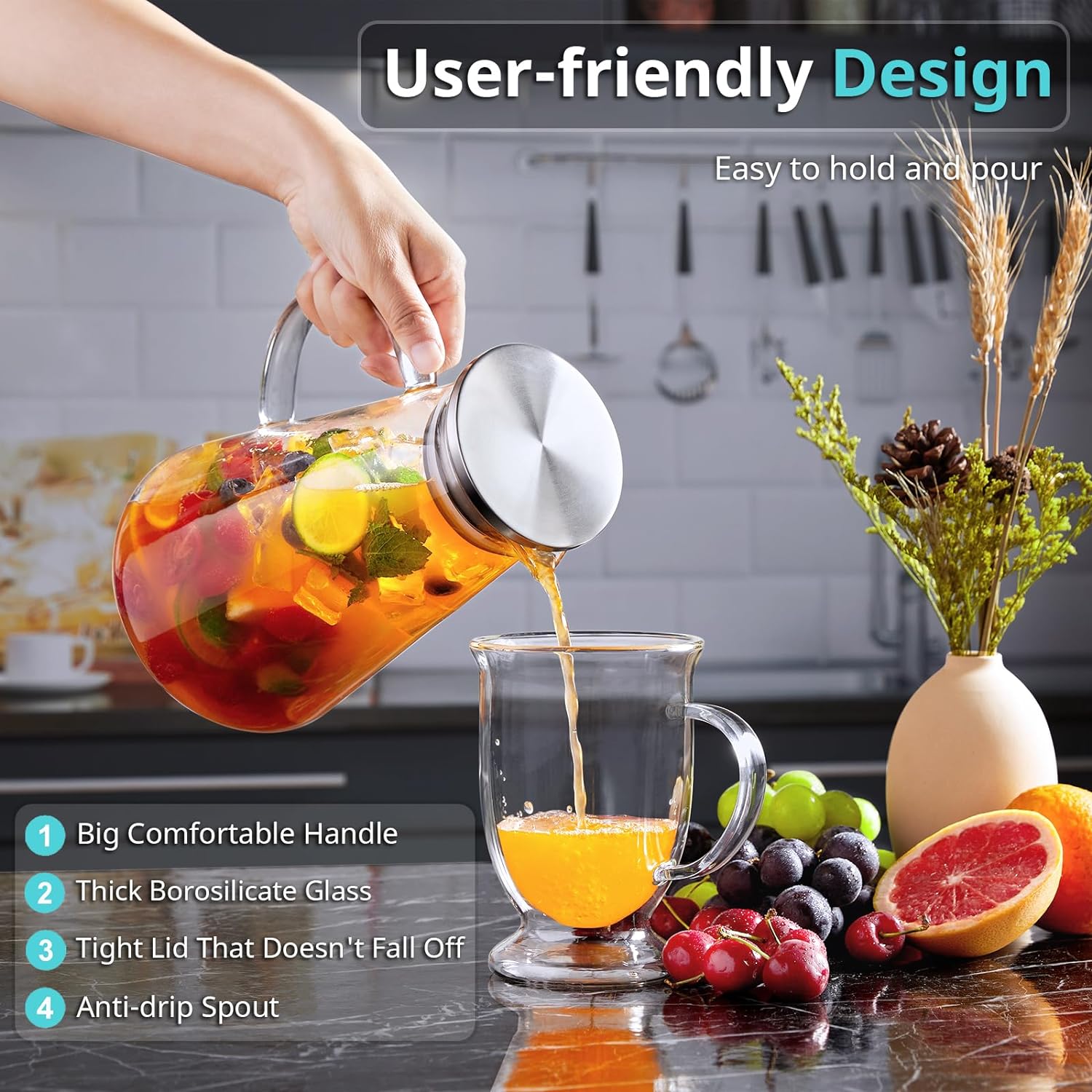 This glass pitcher is widely used for water, iced tea, fruit-infused water, homemade beverages, cold brew coffee, sangria, juice, lemonade, milk, wine, cocktail, light smoothie, etc. Suitable for daily needs at home, outdoors, parties, holiday gifts, etc.