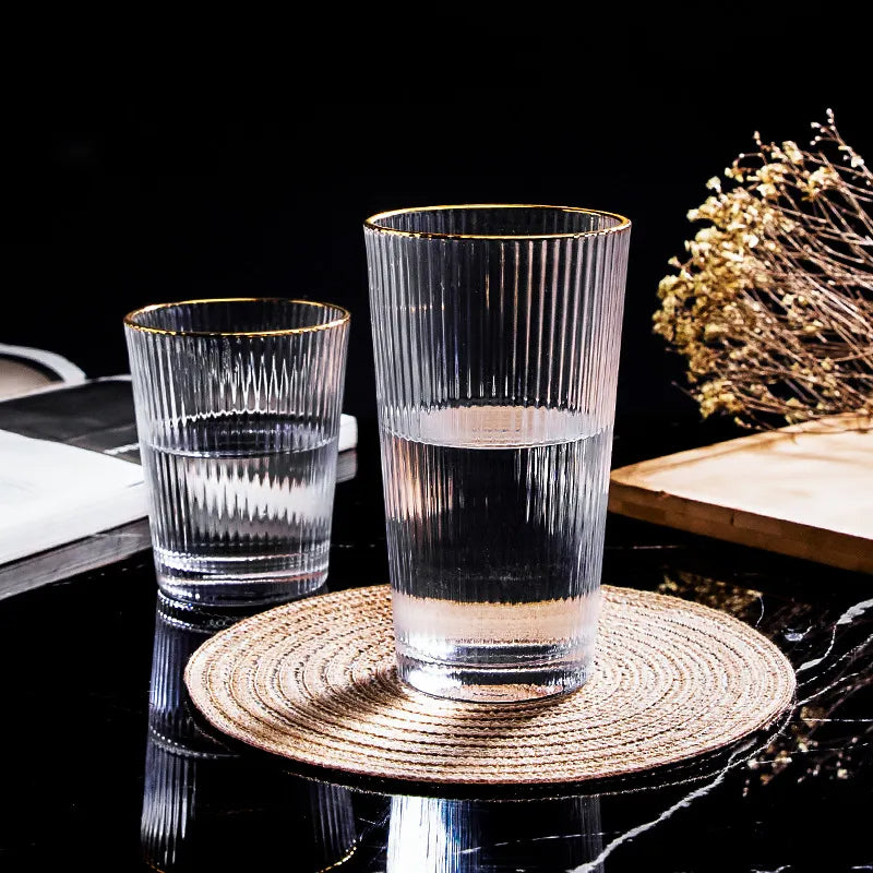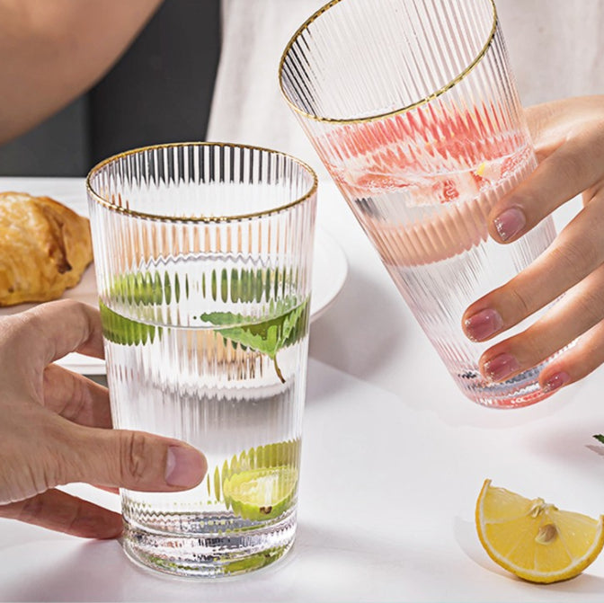 This striped glass with gold rim is simple yet stylish. This striped glass is ideal for pouring drinks such as water, juice, milkshakes, smoothies, iced tea, milk, coffee. Made of thick food grade glass, these stripe glass cup are sturdy, high transparency and safe for everyday use. The glass is designed with vertical stripes for simplicity and beauty. Pour your favourite drink in this striped glass cup and serve it with your favourite food, then enjoy a relaxing leisure time. This excellent water glass set is the best present idea for friends, family members, coworkers, women and men who enjoy a healthy lifestyle.