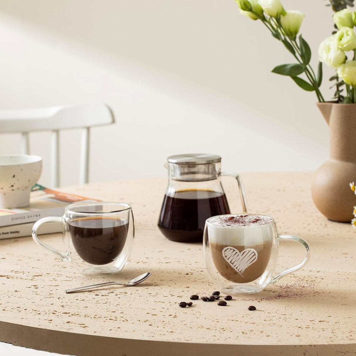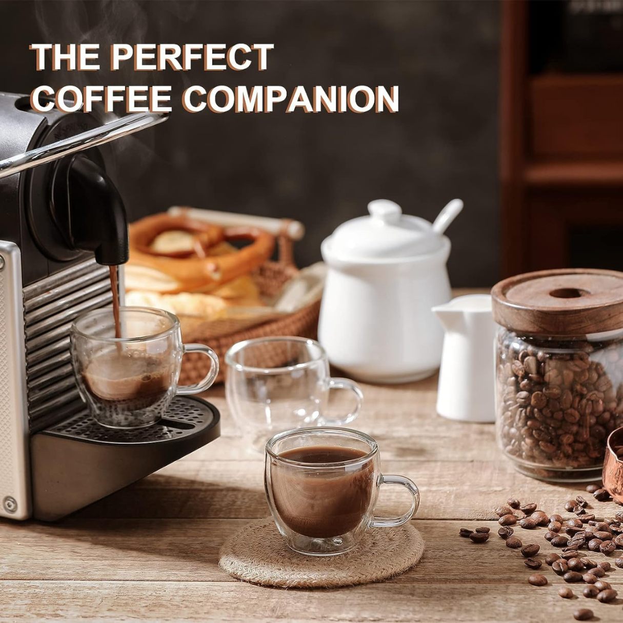 Double-wall coffee mugs, each mug boasting a unique curvature. These double walled coffee cups will suspend your hot or cold beverage within an inner wall, creating the engaging effect of your drink floating. Enhance your coffee indulgence experience! These espresso cups are made of heat and condensation-resistant borosilicate glass, which is stronger and more durable than common glass that gives a smooth finish and a crystal clear look. Lead-free borosilicate glasses can withstand temperatures ranging from -30°C to 302°C! Keep your fingers safe and cool with heat resistant and double wall glassware, so beverages stay warm without you getting burnt! When you have hot coffee, you won’t feel hot from outside and when you have cold drink, there is no condensation on the glass and table. Each coffee mug holds up to 100ml to the rim, which is small enough to go with an espresso machine as well as a coffee maker, ideal for cappuccino, milk, espresso, juice, wine, latte, or tea bag. Beautiful addition to any cafe, restaurant, pub and definitely to your own home.