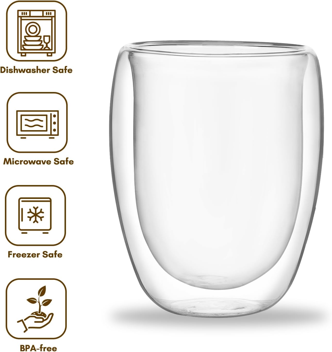 Double Wall Thermal Espresso Glasses, Made of tasteless-borosilicate glass that are light and robust at the same time. The mouth-blown double wall design keeps your coffee hot longer, while protecting your fingers from the heat. Under the glass floor is a hydrophobic silicone membrane, which serves to equalize the pressure between the glass walls. Apart from being used for coffee and espresso, these cups are also a creative way to serve your guests ice cream and dessert! Important: Hand wash recommended, Please avoid contacting with sharp objects when cleaning.