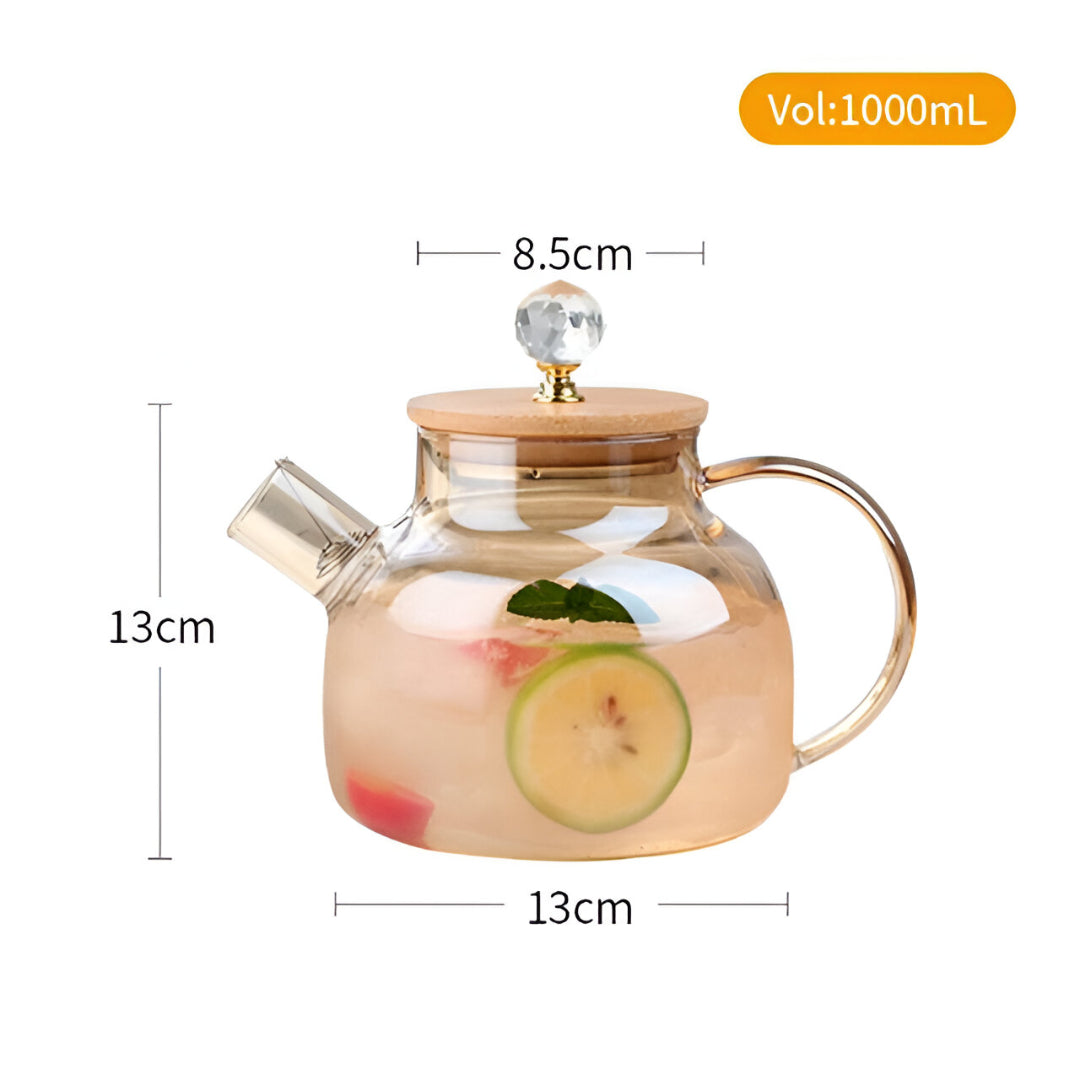 With a capacity of 1000ml, it’s ideal for daily hydration or for serving guests in style. The ergonomic glass handle ensures a comfortable grip, while the wide spout design prevents spills. The wooden lid topped with a faceted crystal knob adds a luxurious charm, making it a stunning centerpiece for any gathering or kitchen setup. Though not heat-resistant or suitable for stovetop or microwave use, it’s perfect for pouring boiled water, serving chilled drinks, or displaying infused beverages in style. A charming and practical gift for tea lovers, home entertainers, or anyone who appreciates elegant serveware. Easy to clean and dishwasher-safe.