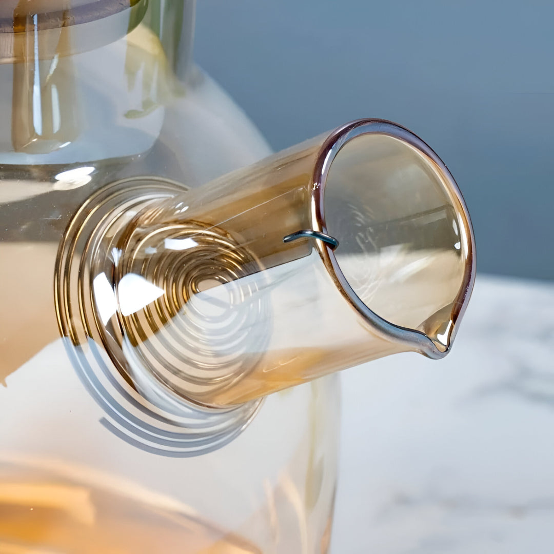 Bring timeless elegance to your table with our Golden Glass Kettle with Wooden Crystal Lid 1000ml. Crafted from premium-quality tinted glass in a soft gold-champagne hue, this elegant pot exudes sophistication and warmth. Designed for serving, not stovetop heating, it’s perfect for preparing and pouring detox water, fruit-infused drinks, herbal teas, iced beverages, lemonade, and cold brews. The stainless steel infuser on the spout filters out tea leaves or fruit pieces smoothly, while the wide mouth allows for easy filling and cleaning.