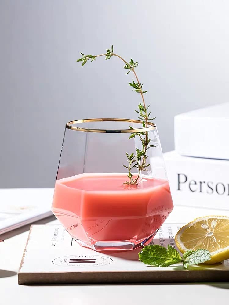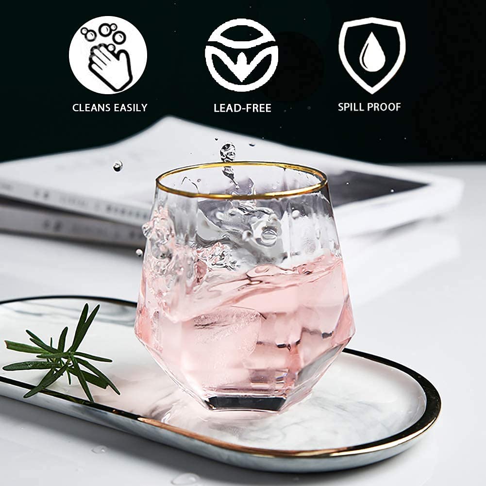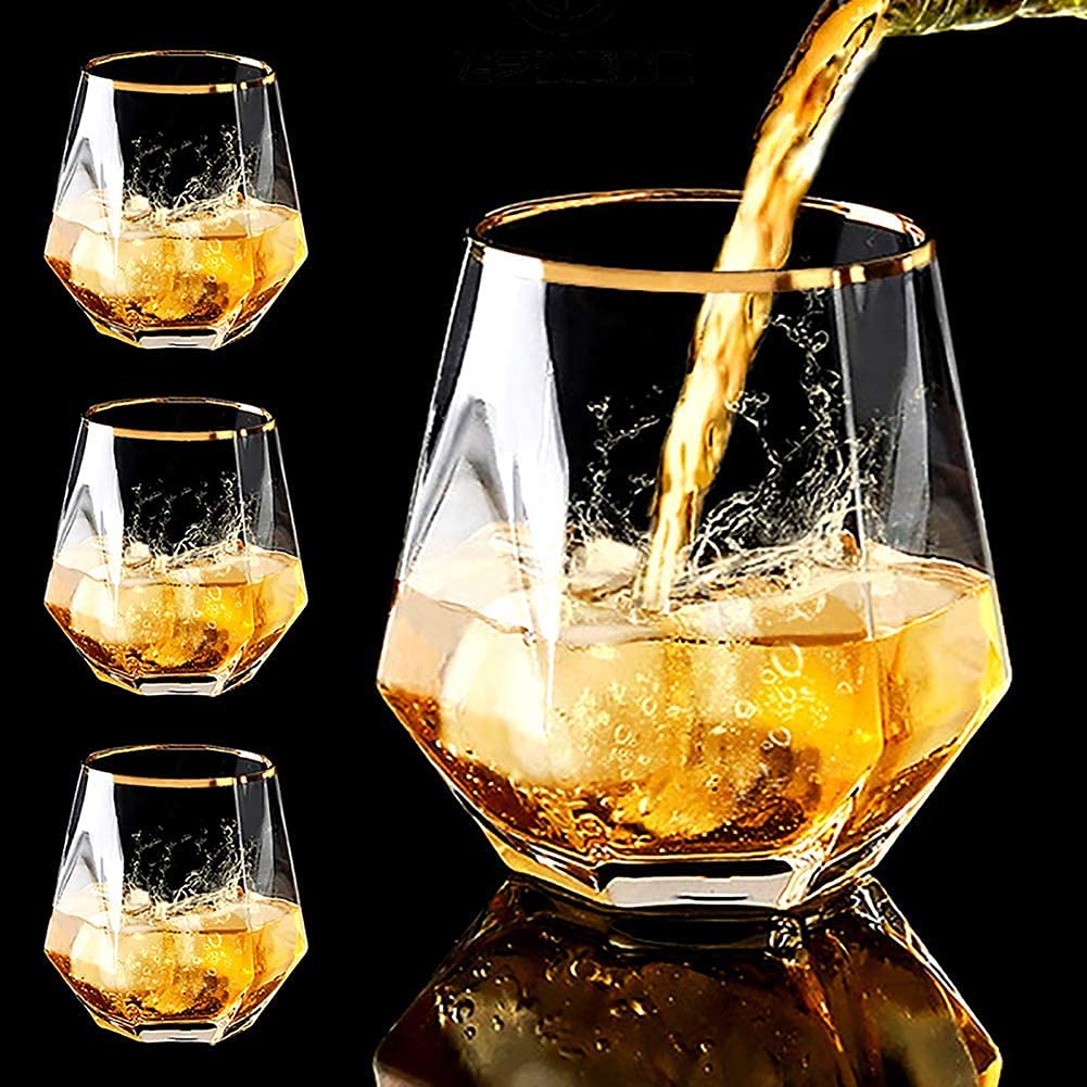 Raise a glass of your favourite scotch in style with our Bourbon Glass Set. Each cocktail glass measures 3.5 x 3.5 x 3.6in and fits comfortably in your hand. Cheer on the New Year or celebrate your loved one’s marriage with the hand-blown crystal diamond-shaped glassware. Hexagonal-shaped base can be tilted at a 50-degree angle and will not topple over when filled with alcohol and ice cubes. Gold rim adds an elegant touch to any event and the wide mouth opening prevents spills and overflowing. Fill the alcohol glasses with scotch, whisky, wine, mixed drinks, cocktails mixes, vodka, gin, or use as an elegant juice or water cup for your non-drinking friends. Select your drink of choice and sip with class with our Bar Glass Set.