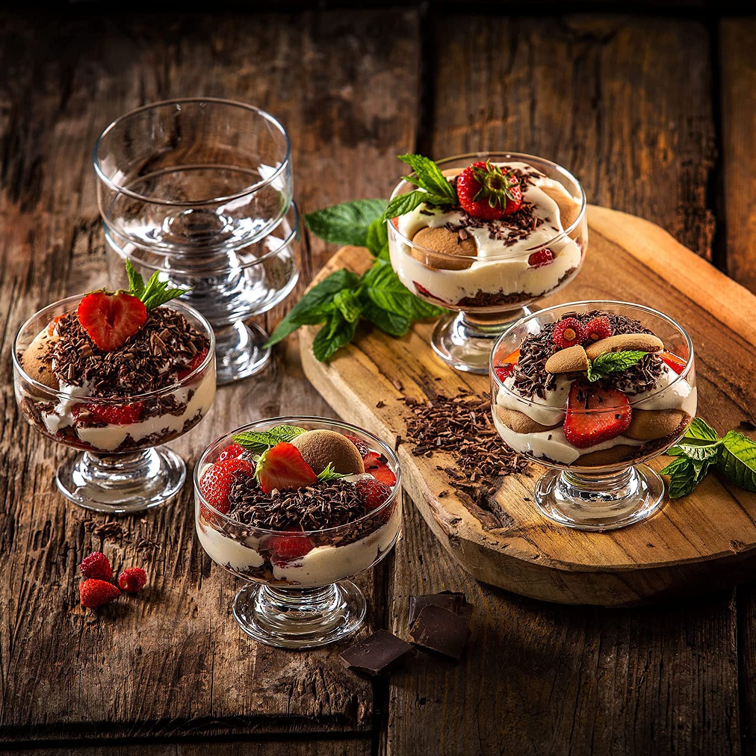 Our ice cream bowl set are made with high quality toughened clear and smooth glass. These excellent dessert cups set are perfect for serving ice cream, trifle, parfait, sundae, pudding, frozen yogurt, gelato, fruit parfaits, condiments, candy, nuts, sweets, Turkish delights and other healthy snacks. Dessert bowl set which can be used also small trifle bowl does not contain harmful elements such as lead and safe for eating and drinking. Lead-free glass not only safe for food contact but refracts more light than ordinary glasses, so you can see your food more clearly. The footed mini dessert cups a perfect addition to your kitchen collection at home or your shop. Comfortable in the hand; wide foot provides easy handling. Ideal to present your desserts. It is dishwasher and refrigerator safe. Capacity 190ml. Perfect size to enjoy your ice cream! This ice cream-dessert bow set is an excellent gift for any occasion. It is also suitable for trifle or gelato. The perfect gift for Christmas, Birthday or Wedding Anniversary. Great for engagement parties, promotion parties, gatherings with friends, or formal dinners.