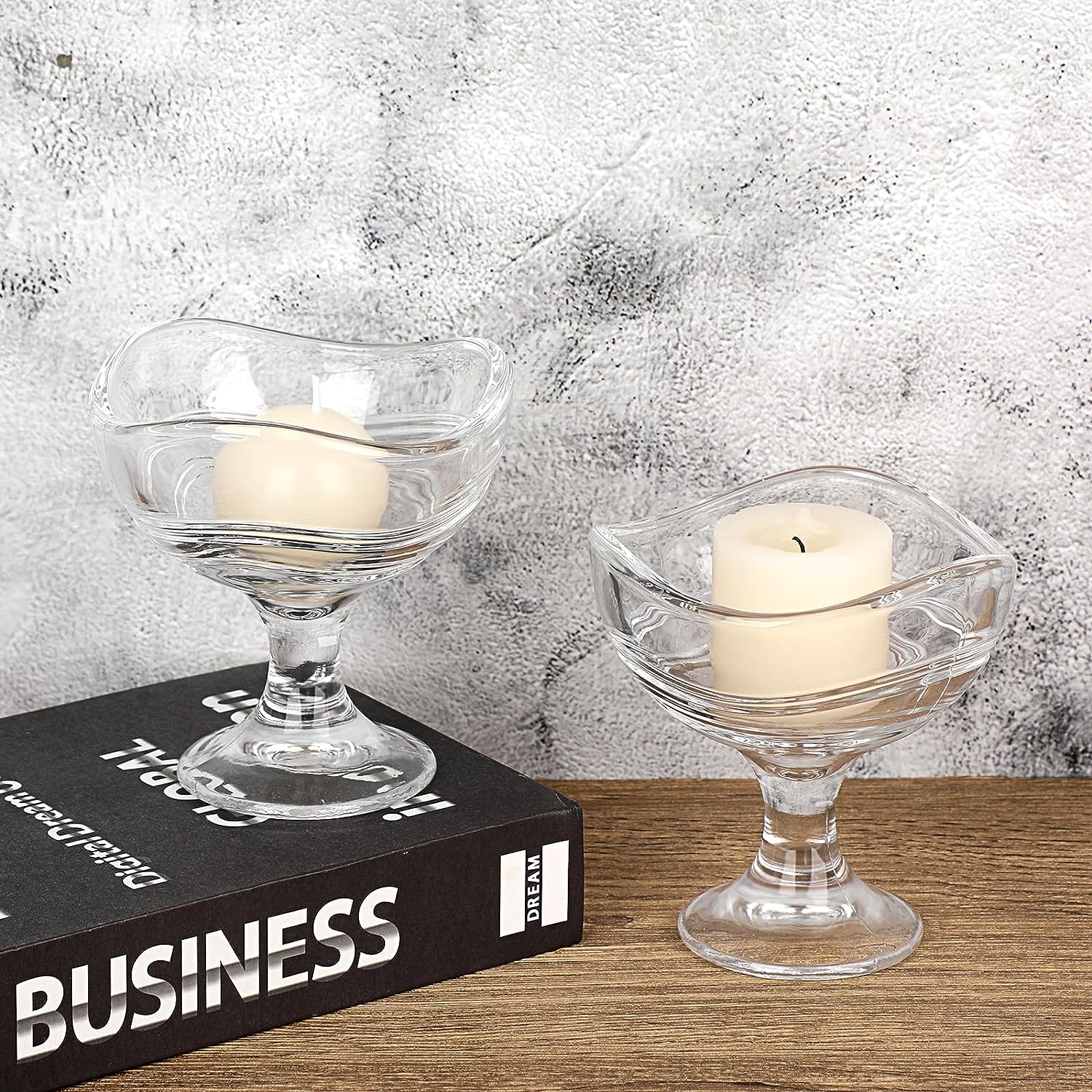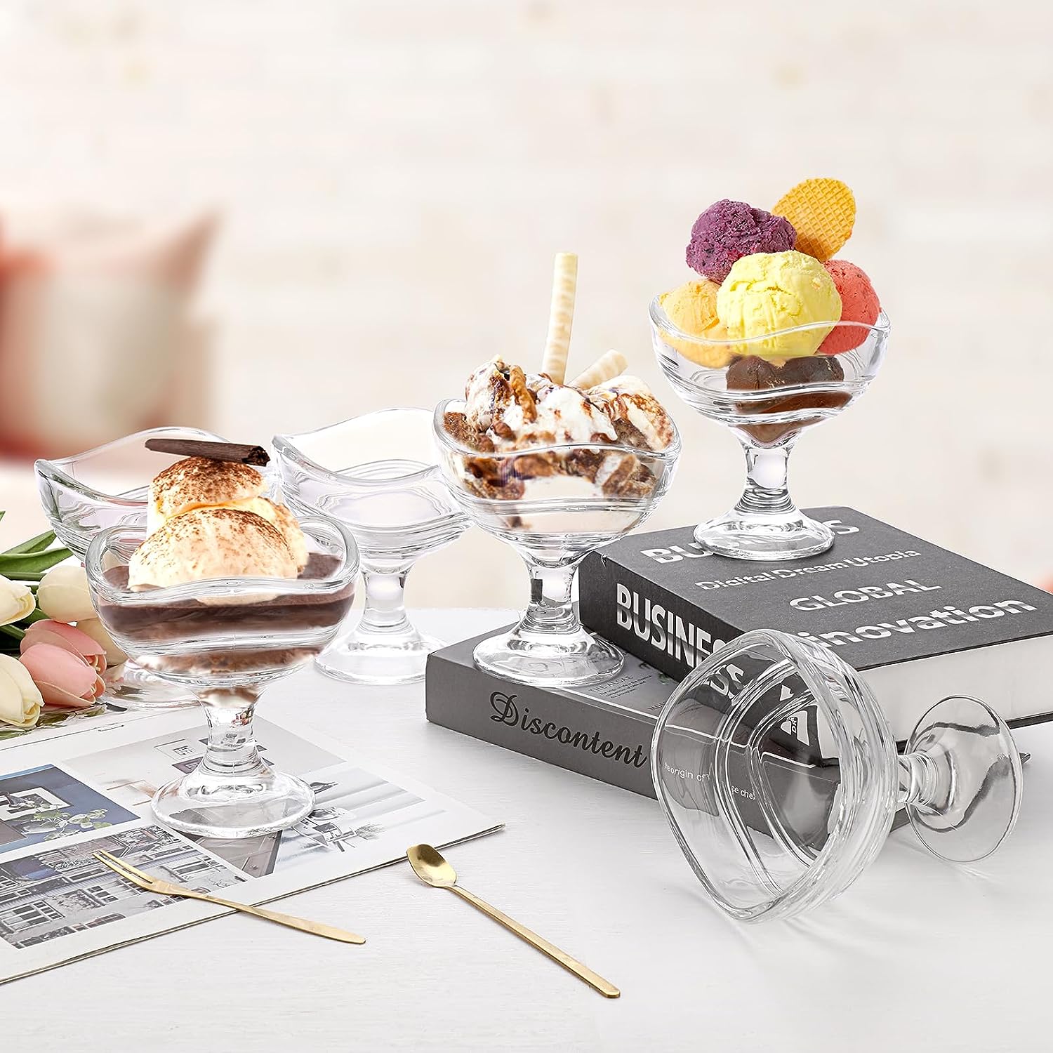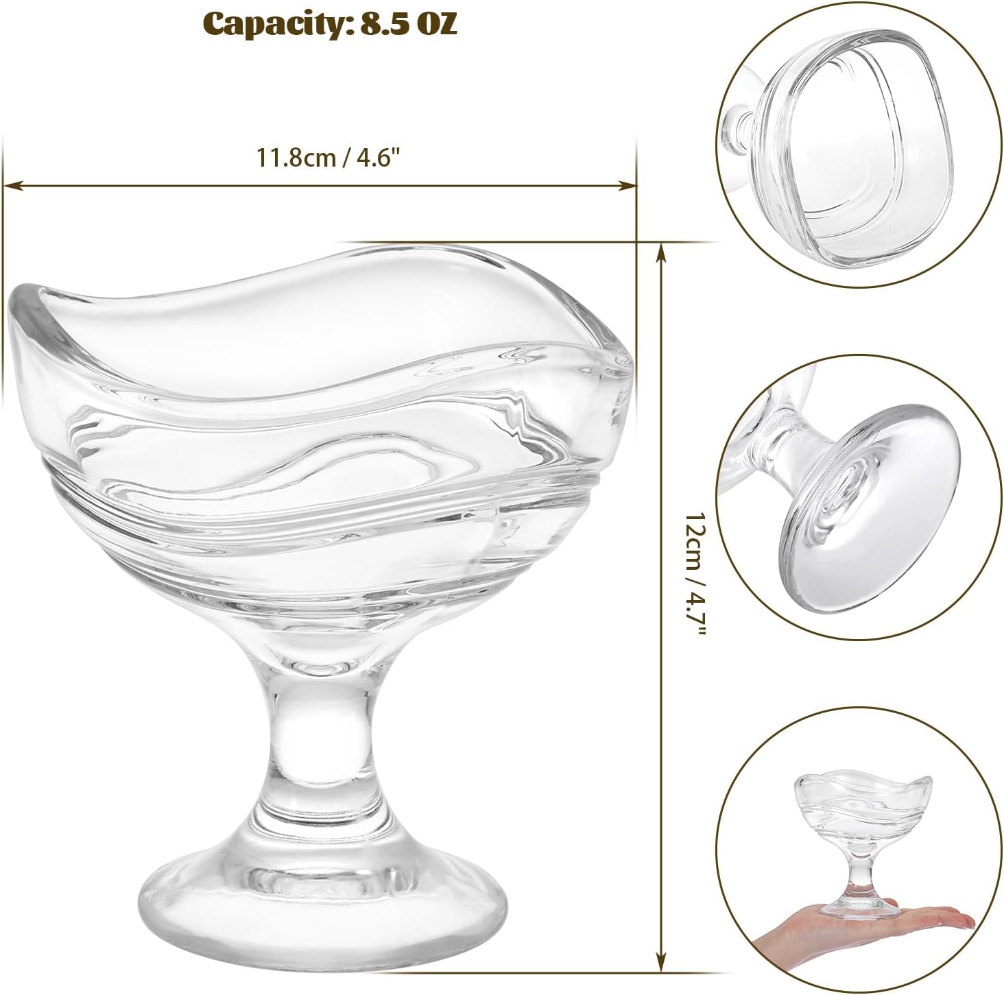 Made with premium clear smooth glass. Lead free and healthy eco-friendly, safe for eating and drinking. Smooth wavy pattern glass body, comfortable in the hand. Wide foot easy handling. Idea gift for housewarming, parties, weddings, and events. Capacity 150ml, perfect size to enjoy your ice cream. Dishwasher and refrigerator safe. Just clean the dessert glass cups with water and dry with a soft cloth. The glass dessert cups set are perfect for ice cream, trifle, parfait, sundae, pudding, yogurt, fruit, candy, nuts, sweets, salad, snack, cocktail, condiment, trifle and holiday party.