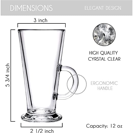 Tall Irish Coffee Mugs with Handle, Tall Funnel Clear Glasses for Iced Coffee, Latte, Cappuccino, Hot Chocolate, Breakfast Tea, Espresso, Plain Coffee, Herbal Tea, Black Tea and any other hot or cold beverages. There is no reason why you should limit the use of these glasses to the drinks they are named after. Our cute tall latte cappuccino glasses/cups set makes an elegant addition to your kitchen, dinner table or office. You can use this durable lightweight dishwasher-safe set for a longer period. If you are a coffee or tea lover, you will love this cool glass set.