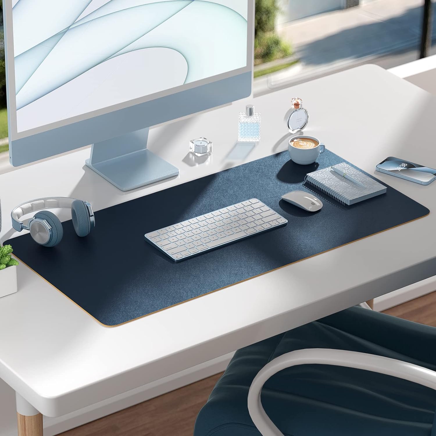 Our desk mat is made of heavy duty and durable PU leather, which can provide a layer of protection between desks and scratches, stains, spills, dents and scuffs, giving more protection to your premium desktop surface. We have various sizes perfect to hold your laptop, mouse, keyboard and other small things. It is 2mm thick, just enough to give it a soft and resilient feel. The smooth surface can be used as a mouse pad, writing and painting smoothly. A good desktop protector choice for office work, home, decoration. Due to the waterproof PU leather surface, our desk pad will make your desk cleaner and tidier. The leather desk pad will protect your desk from spilled water, drinks, coffee, ink and other liquids. When an emergency happens, all you need to do is wipe with a wet cloth or paper. And the little strap is in the attachment. When you want to store it or take it with you, just roll the pad up and pull the strap tight. It's very light, so you can take it anywhere. We designed it with the same material but with different colours and non-slip grains on each side, and you can use both sides. Just turn it over and you have a new one. Dual Side Color adds colour to your life and gives you a much fresher experience.