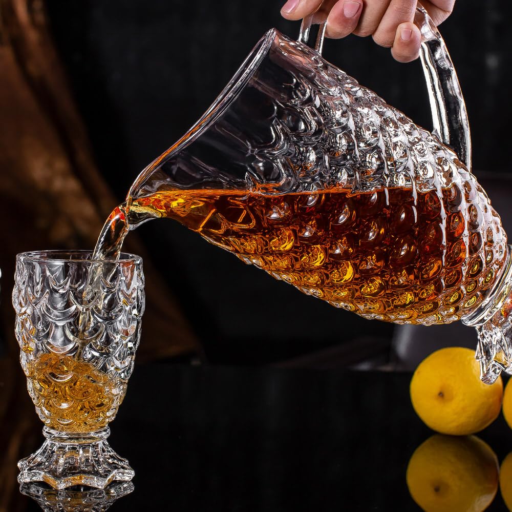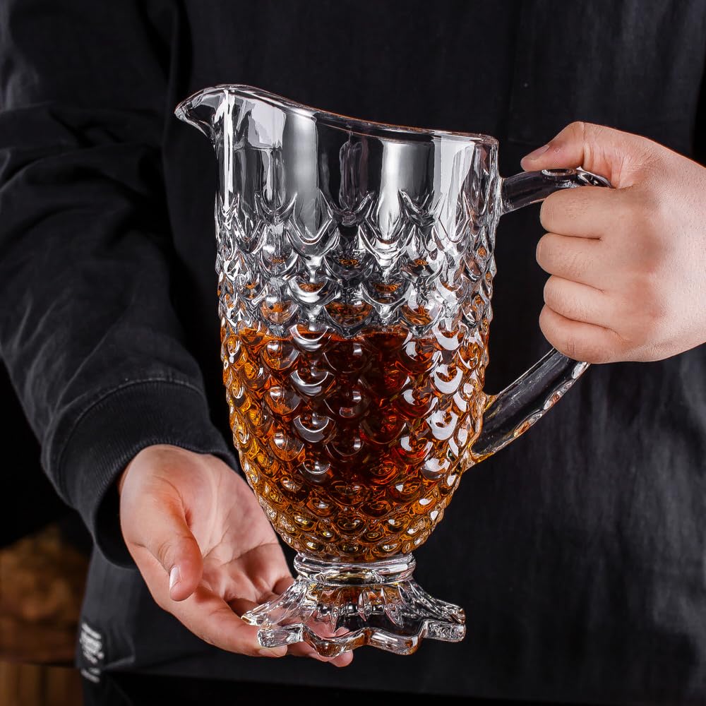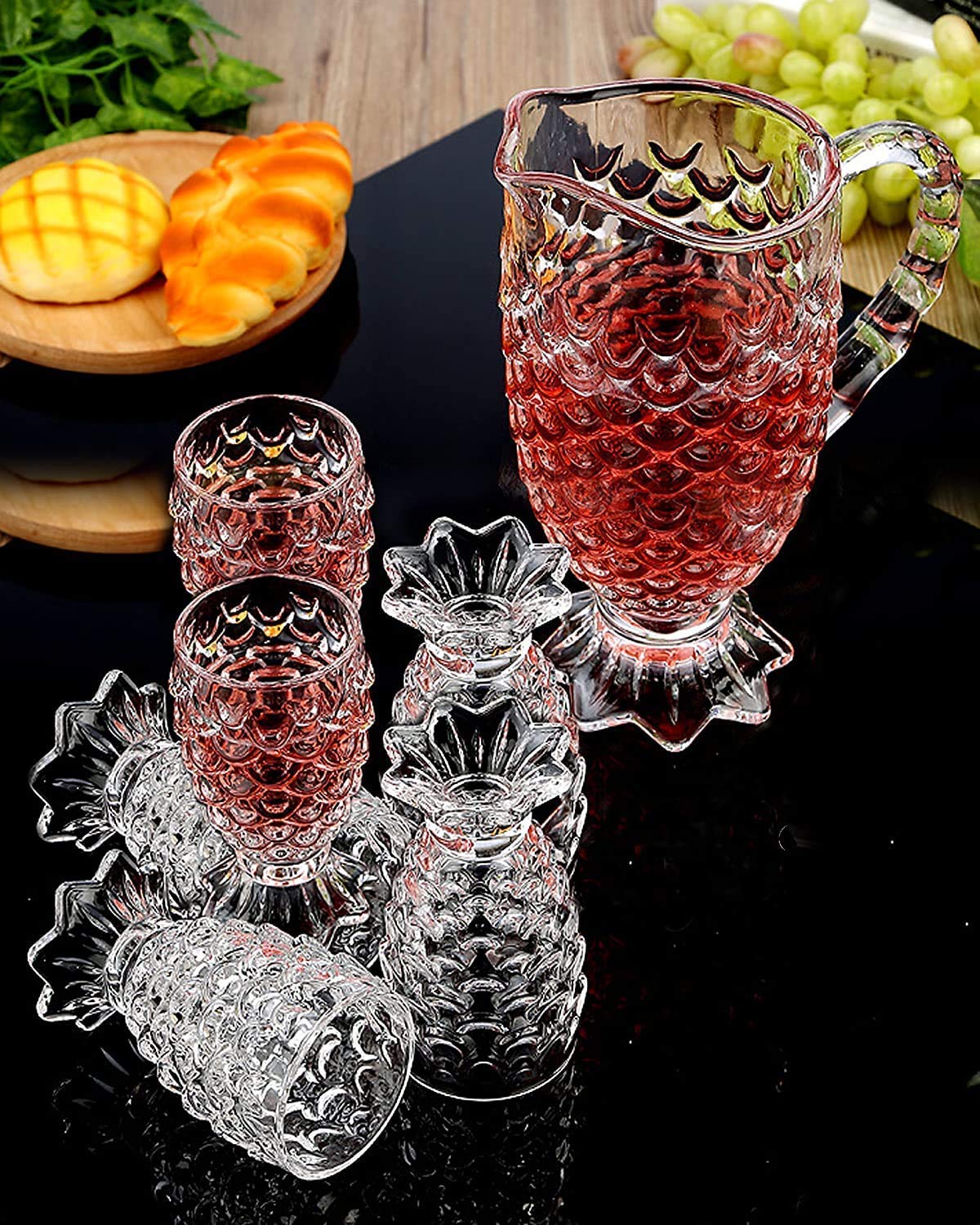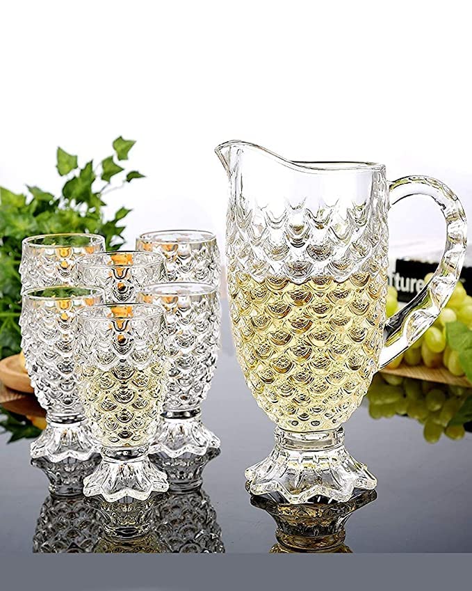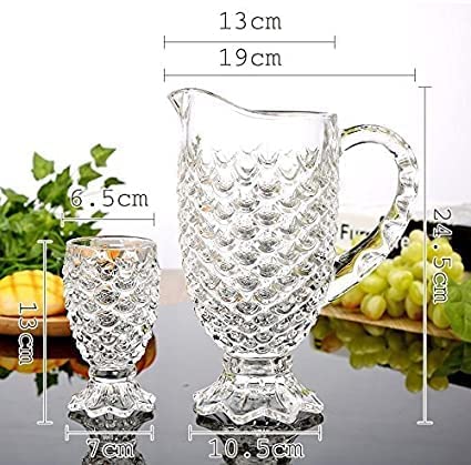 Pineapple Design Crystal Glass Water Juice Jug 1300ml can be used for many kinds of liquid such as iced tea and fruit juices, aid for children and much more. Ideal for use at home or even outdoors to serve cold drinks on the patio with all your guests during spring and summer events. Made of lead free crystal premium silicate glass will make sure that any cocktail or dram will be presented in a fantastic manner, allowing for an unadulterated tasting experience. This set has been beautifully designed to add grace to dining experience. This Glass Jug Pattern like a Pineapple which shows the elegant design. The Jug handle is large which provide the comfortable grip while the hold or serve the drinks.