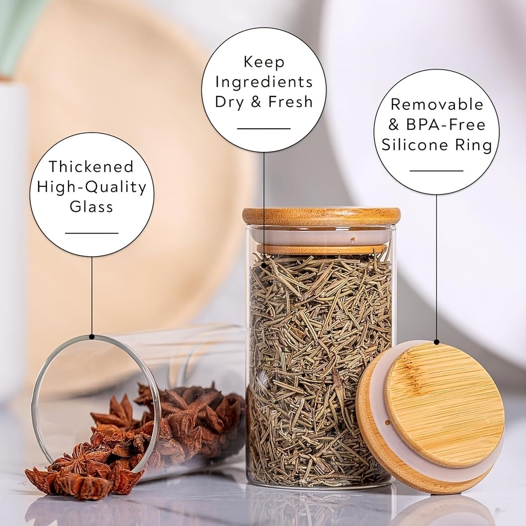 Glass storage jars are crafted from food-grade high borosilicate glass, the wooden lid is more environmentally friendly and healthy. The bamboo wood lids with an all-round silicone sealing loop create an airtight and moistureproof environment to keep your food fresh. These small glass jars set can help you to sort and store a lot of items, all of them are stackable for space-saving storage and make your room clean and beautiful. The bamboo wooden lid and clear glass offer a minimalist and modern design that blends in perfectly with your appliances and decor. Perfect glass containers apply to Kitchen, Bathroom, Home Decor, Party Favors, Thanksgiving, Christmas, birthdays gifts. And is widely used in spices, herbs, seasonings, loose leaf tea, condiment, snacks, jams, honey, etc. They are easy to clean, quick scrub, rinse, just place the glass jar in the dishwasher, and wipe the lid with mild soap and warm water.