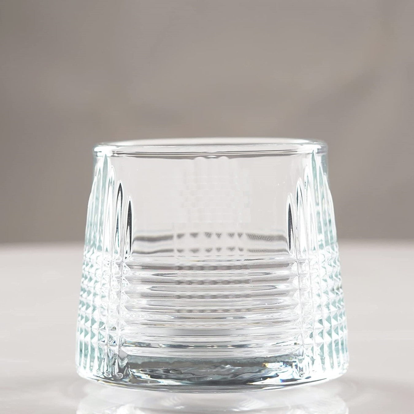 Expertly designed for an elevated drinking experience, this set of 6 Spinning Glass Criss Cross Lines glasses adds a touch of sophistication to any occasion. With a capacity of 170ml, these glasses feature a unique criss cross design that creates an optical illusion as it spins, making it both functional and visually stunning. Elevate your hosting game with this captivating set.